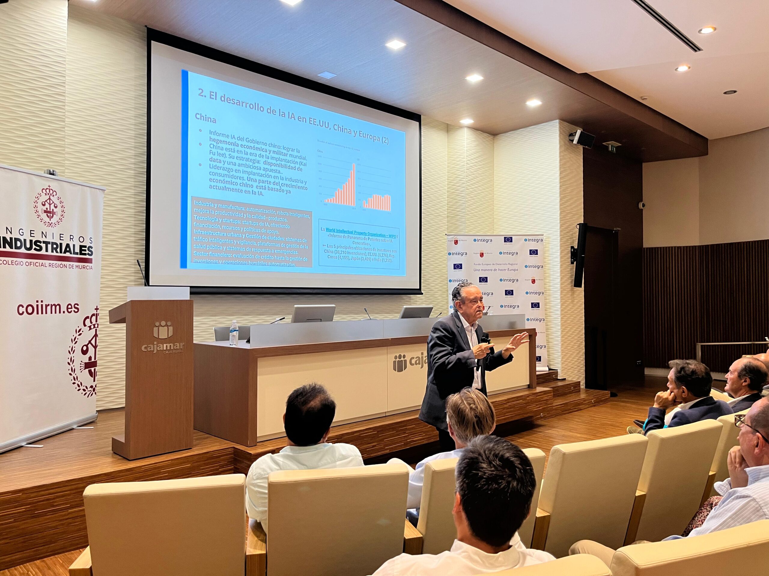 El pasado 12 de septiembre, tuvo lugar en el salón de actos de Cajamar la Jornada Ciclo Agro+ Digital, organizada por el Colegio de Ingenieros Industriales de la Región de Murcia (COIIRM) en colaboración con la Fundación Integra Digital. Esta jornada, centrada en la transformación que la Inteligencia Artificial (IA) está generando en sectores tradicionales como el agrícola y el agroalimentario, reunió a expertos y líderes del sector para debatir sobre el futuro de la tecnología aplicada a estos campos clave en la economía regional.
